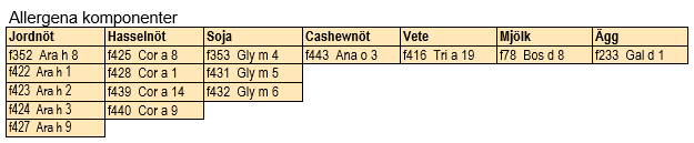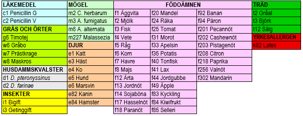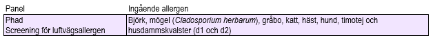 Nedanstående panel och specifika allergen ingår i laboratoriets sortiment. Sortimentet är valt i samråd med allergologer i Region Norrbotten.