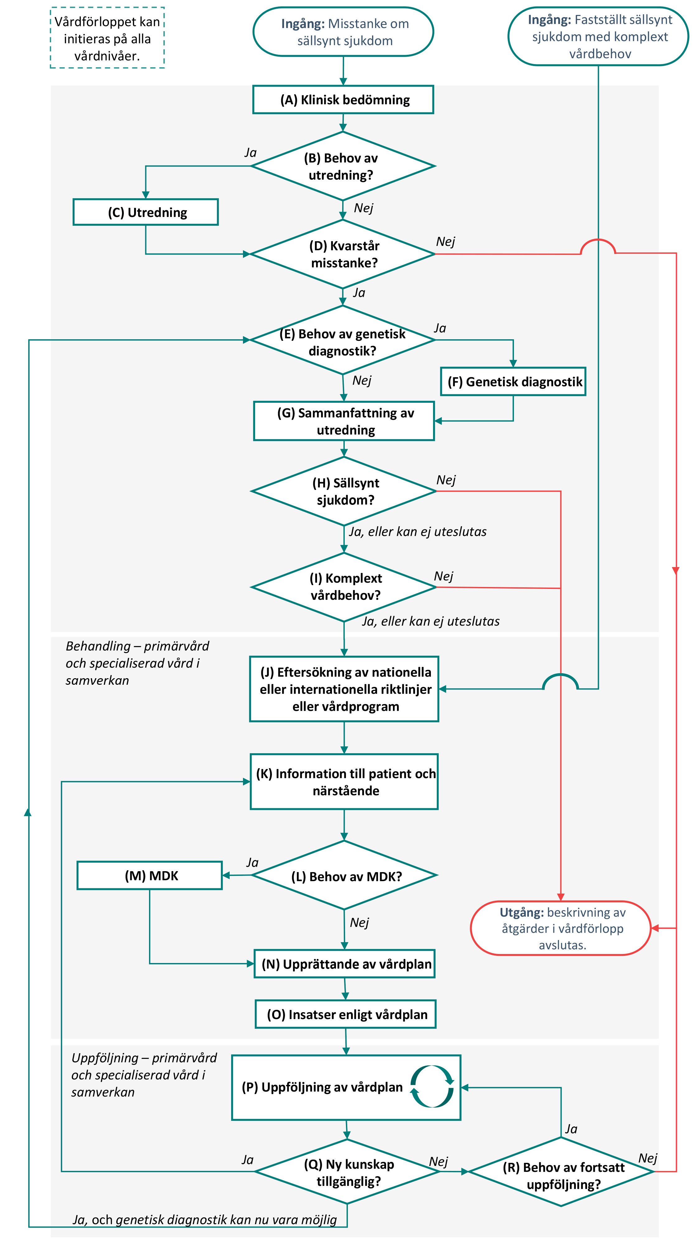 Vid misstanke om sällsynt sjukdom med komplexa vårdbehov, där det saknas en annan känd orsak till symtomen, bör en fördjupad bedömning och handläggning göras enligt upprättade regionala rutiner.