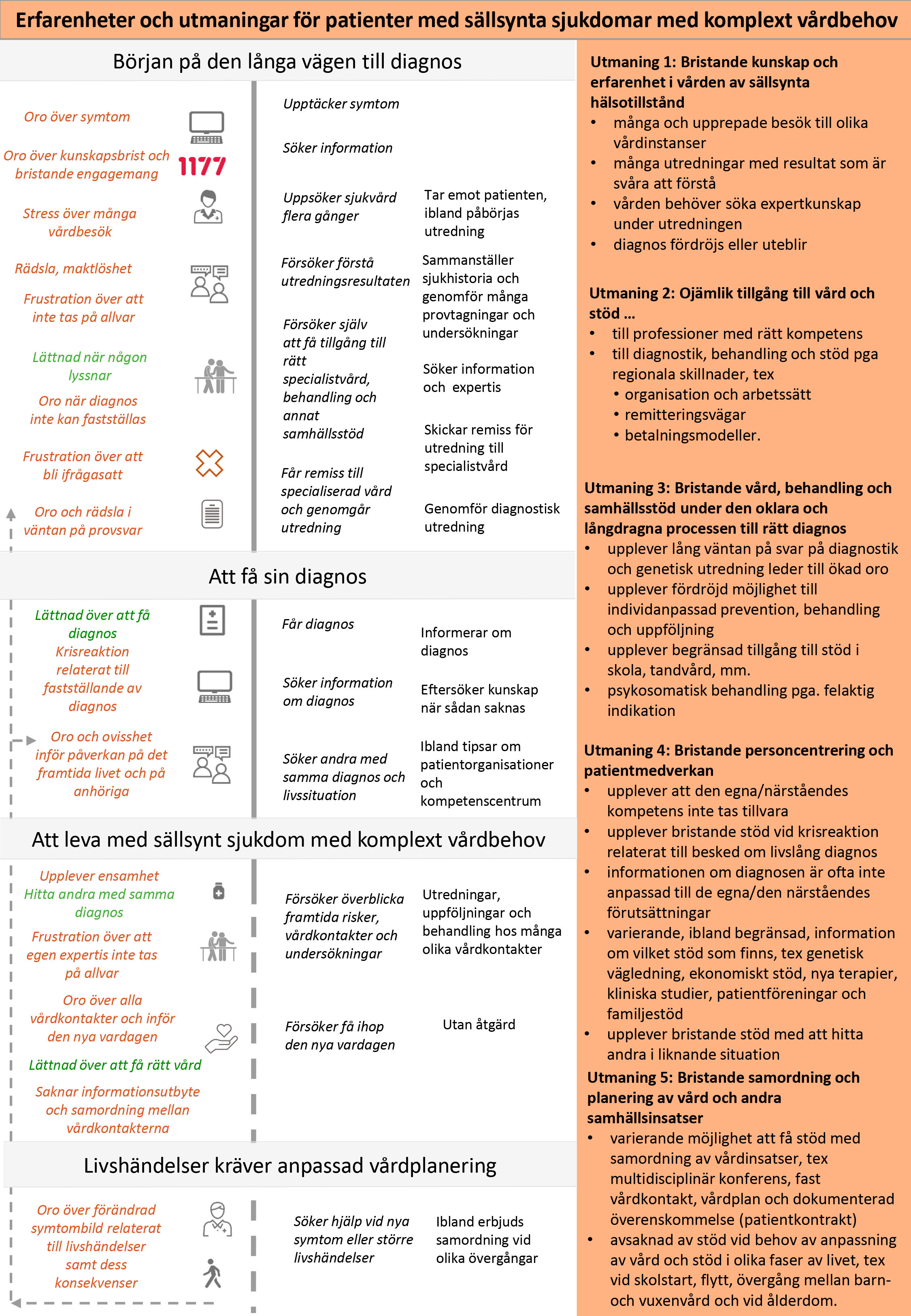 Bilden nedan är en grafisk presentation av i nuläget vanligt förekommande erfarenheter av hälso- och sjukvården hos personer med sällsynta sjukdomar och komplext vårdbehov.